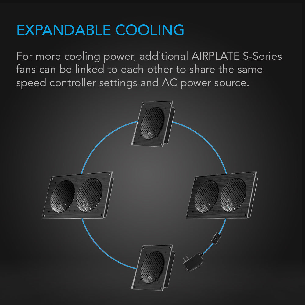 Para los gabinetes que requiere más flujo de aire, cada unidad puede conectarse adicional AIRPLATE S y T serie ventiladores para gabinete. Hasta cuatro ventiladores pueden compartir la misma fuente de poder USB; y hasta seis ventiladores pueden compartir el mismo controlador térmico o toma de corriente de pared. AIRPLATE S3, T3 contiene un ventilador AIRPLATE S7/T7 contiene dos ventiladores y AIRPLATE S9/T9 contiene tres ventiladores.