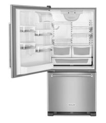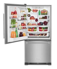 A bold blend of professionally-inspired styling and sleek touches for the home. This refrigerator features Satin Textured Handles with iconic KitchenAid Brand Medallions and a beautiful chrome frame.