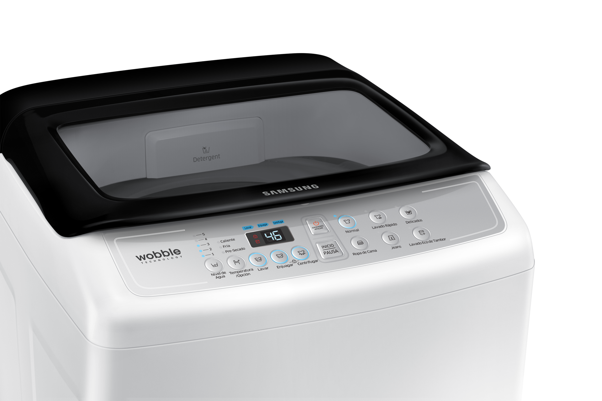 La lavadora de Samsung tiene un panel de control doble inclinado que es más cómodo e intuitivo. Su diseño ergonómico, con botones a ambos lados, permite seleccionar las opciones correctas para programar y controlar el lavado con mayor facilidad. El panel está en ángulo y ubicado en la parte delantera, e incluye una pantalla gráfica color azul, por ello es más fácil tener acceso y ver lo que estás haciendo.