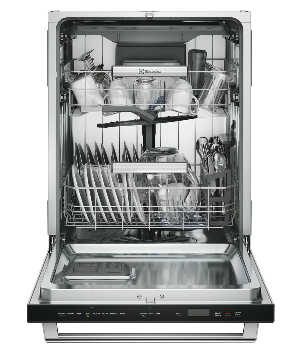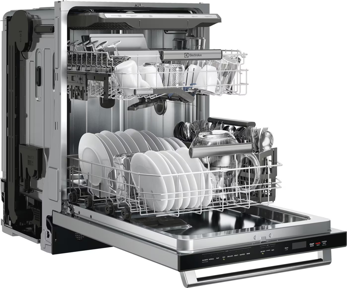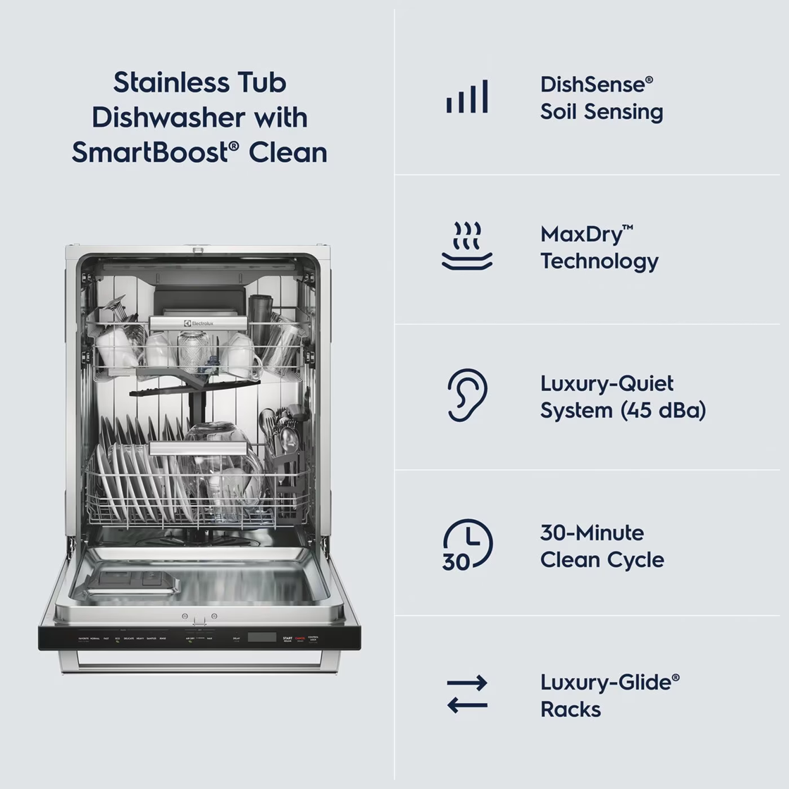 El lavavajillas empotrable Electrolux de 61 cm (24") con cuba de acero inoxidable y tecnología SmartBoost™ Clean maximiza la eficacia del detergente al premezclarlo con agua antes de que entre en contacto con la vajilla, logrando una limpieza profunda y eliminando incluso los restos de comida más difíciles. Este lavavajillas ultrasilencioso (45 dBA) también incluye Max Dry, nuestra función de secado más potente, que se activa con solo pulsar un botón. Cuando tengas invitados, la vajilla saldrá reluciente entre plato y plato gracias a nuestro ciclo de limpieza de 30 minutos.