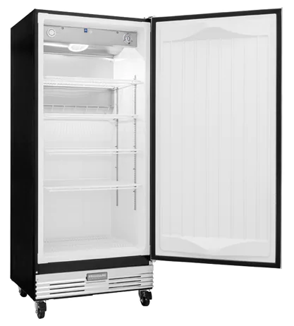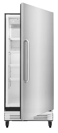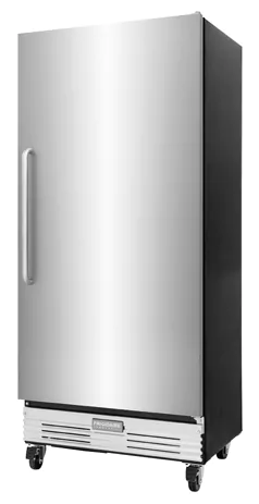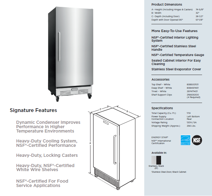 Este refrigerador para servicios alimenticios certificado por la NSF ofrece cuatro (4) estanterías de rejilla en una unidad cuyo interior es acero uniforme, lo que ayuda a una fácil limpieza. Una luz incandescente ilumina el interior, donde un dial mecánico controla la temperatura y un termómetro análogo muestra el estado en el refrigerador. La unidad se sostiene sobre 4 ruedas; las ruedas traseras son giratorias y las ruedas delanteras se fijan en su sitio una vez que usted haya movido el refrigerador con facilidad hacia el lugar donde desea colocarlo. Dicho artefacto también se encuentra certificado Energy Star para un rendimiento ahorrador de energía.