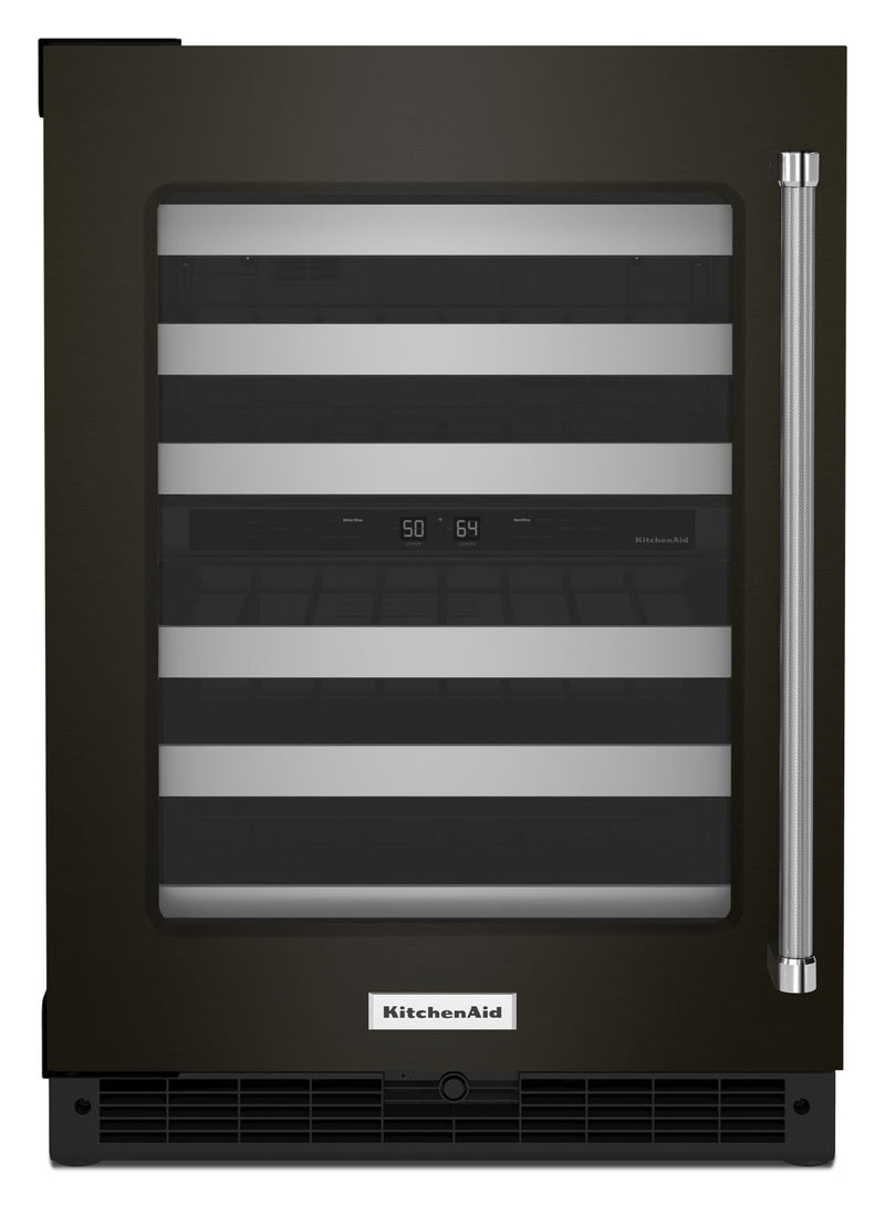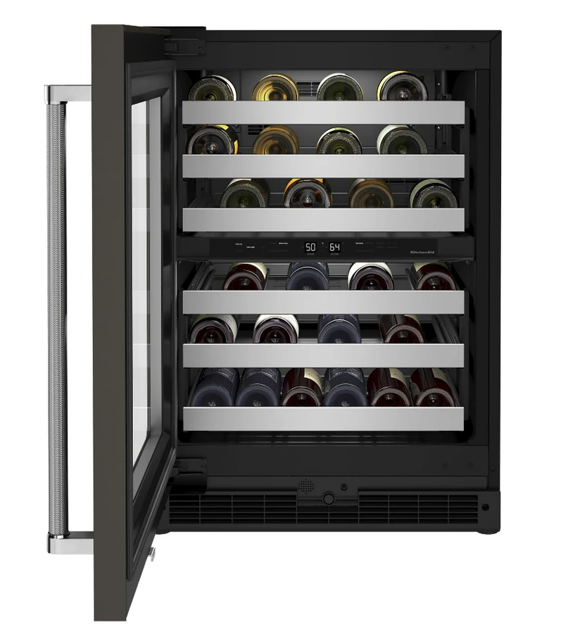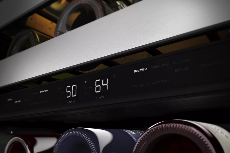 Esta bodega para vinos debajo del mostrador con estantes frontales de metal de extensión total tiene capacidad para hasta 46 botellas de tamaño estándar de Burdeos. Dos zonas con temperatura controlada te permiten separar los rojos y los blancos para almacenar cada uno a la temperatura que disfrutas, y la iluminación LED activada por movimiento se enciende cuando te acercas, lo que facilita ver lo que hay dentro. La instalación completamente al ras con bisagras ocultas proporciona una apariencia integrada dentro de los gabinetes.