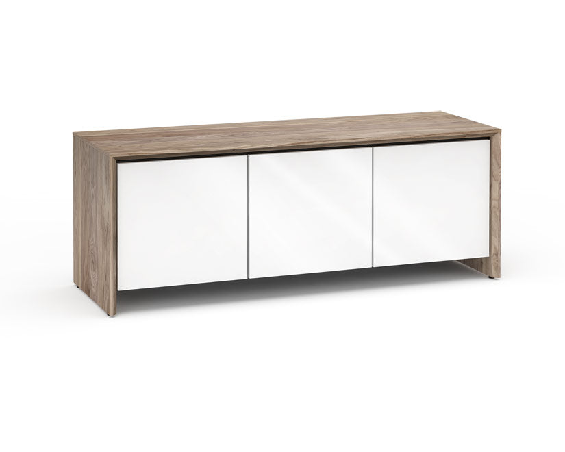 Limpiado y vanguardista diseño con bordes biselados y las uniones de inglete de precisión se destaca por una cereza natural o nogal acabado con cristal ahumado negro o brillante puertas blancas.